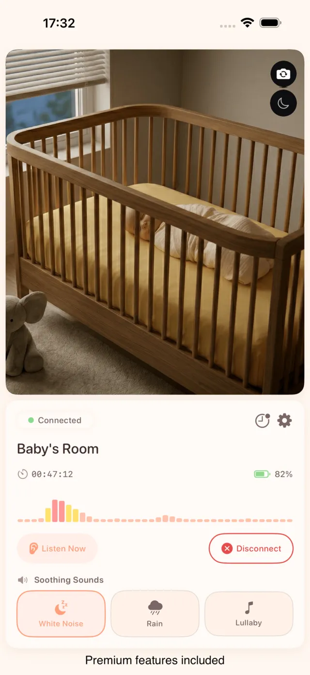 White noise, rain, and lullaby built right in. If your kid sleeps better with sound, MonitorUltra has you covered.